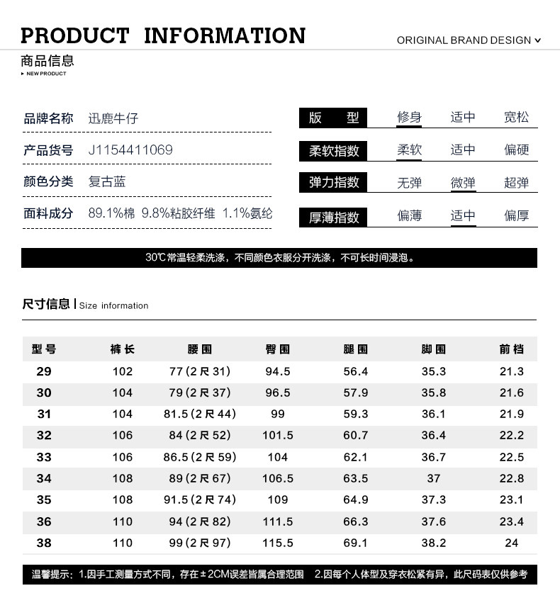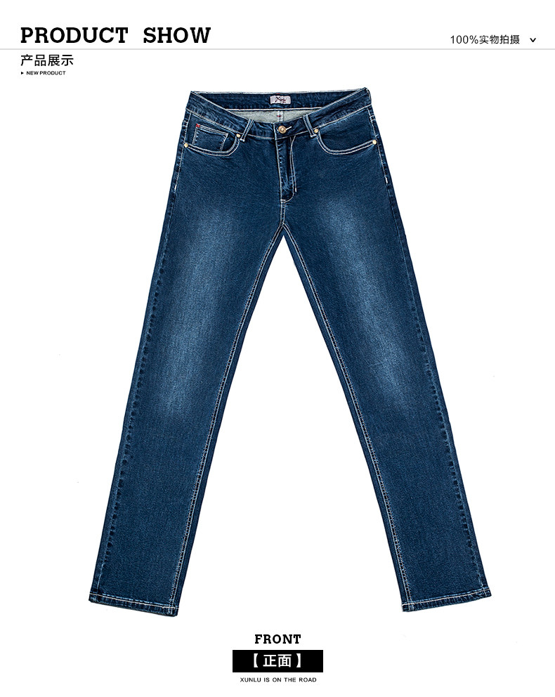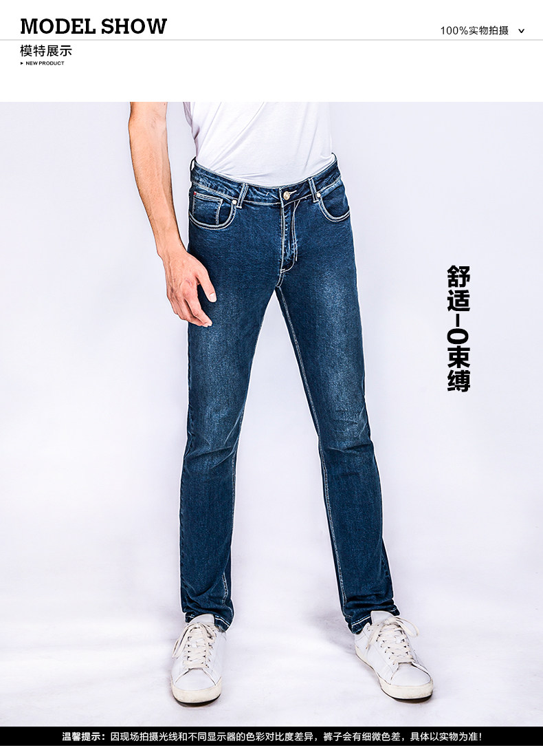 迅鹿牛仔裤男款蓝色修身小直脚牛仔裤